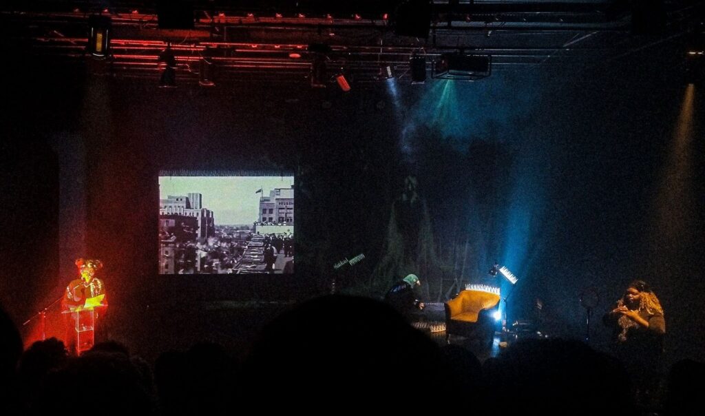 Sobre o borramento, os fantasmas ressurgem pela projeção fílmica que inicia numa tela suspensa e divide protagonismo, em primeiro momento, com a leitura dramatizada de Juliana Fausto como uma representante do sindicato dos pombos. Posteriormente a mise-en-scène se expande com outros elementos que surgem de modo compósito a cena, com Darks Miranda enquanto pessoa-pombo sendo iluminada e outro vídeo é projetado de maneira mais transparente no fundo do palco. Assim a composição que parecia anteriormente separar figura e fundo, sujeito e tela, agora se emulsionam. Tela é figura, sujeito é fundo, tela é fundo e essa alternância de posições dialoga plenamente com as questões de natureza e cultura levantadas pelo texto dramatizado e a proposta cênica de convocar os desamados da terra ao som de Amada Amante de Roberto Carlos. Humor é embalagem constante, mesmo que em jogo com as passagens mais sérias que vão desde a negligência do cemitério dos escravizados no cais do Valongo até à “pombitude” e sua queda como ícone nobre à párias da modernidade urbana, simultaneamente seres marginalizados e símbolos do colonialismo e do fracasso urbano capitalista.